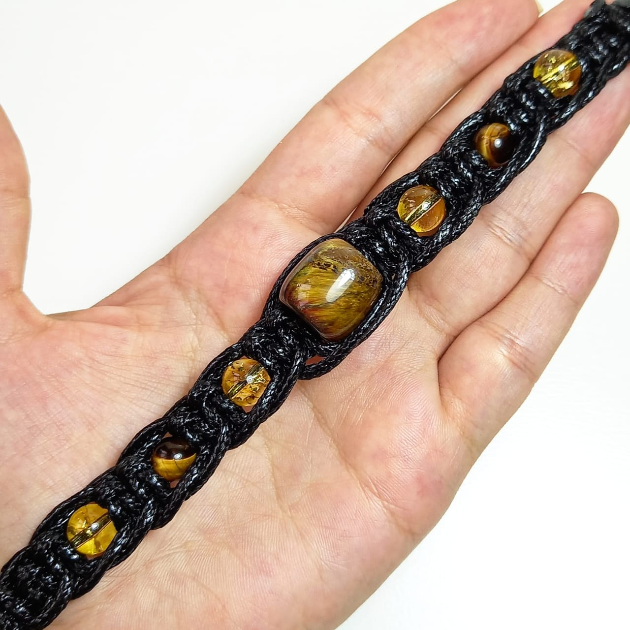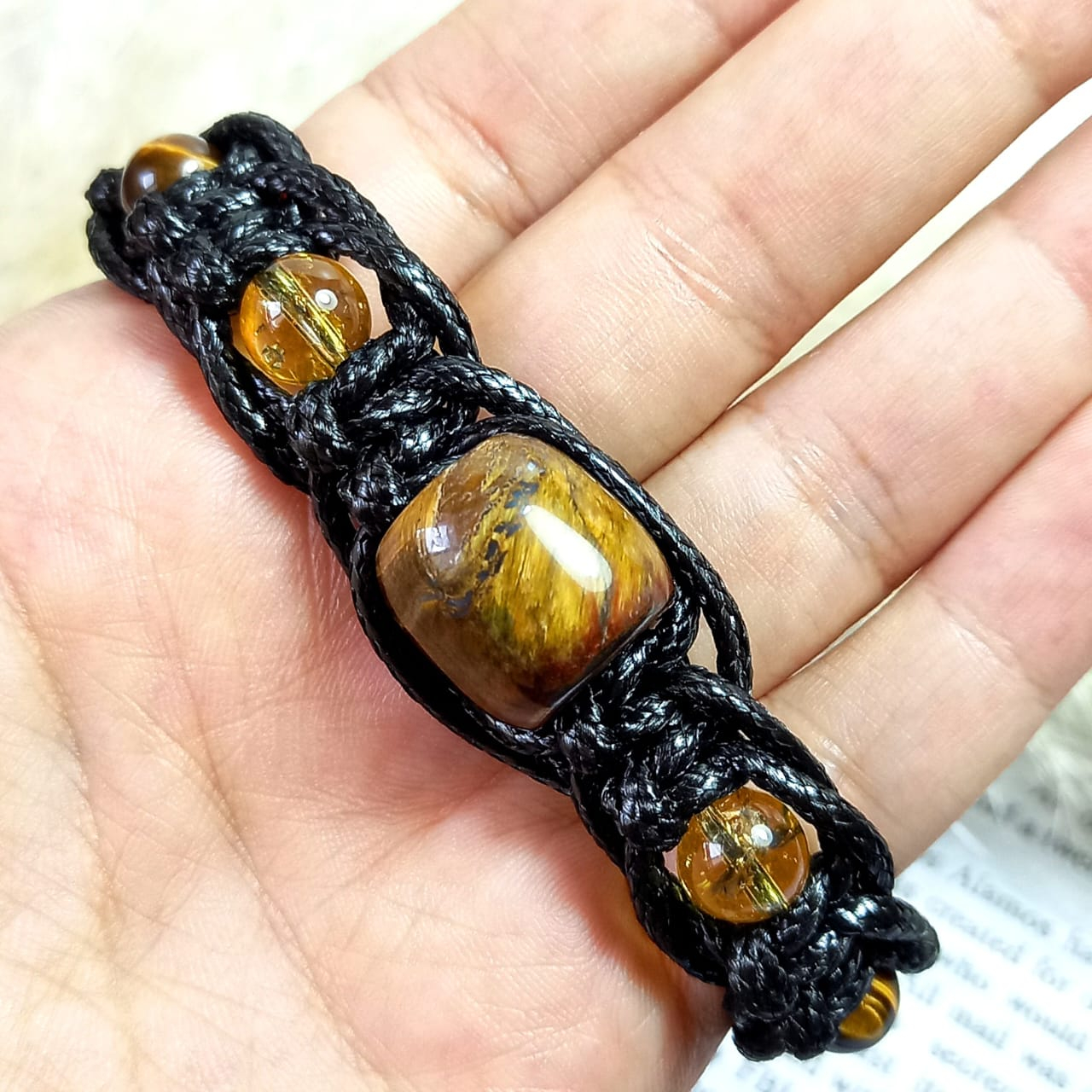 سنگ های به کار رفته سیترین سایز 8 و چشم ببر قهوه ای سایز 8 و چشم ببر به ابعاد 2x1x1 می باشد. کیفیت سیترین و چشم ببر درجه یک و از بهترین نوع سنگ می باشد. دور سنگ ها توسط چرم مصنوعی مشکی بافت خورده شده است. مناسب مچ دست سایز16 تا 23 سانتی متر است