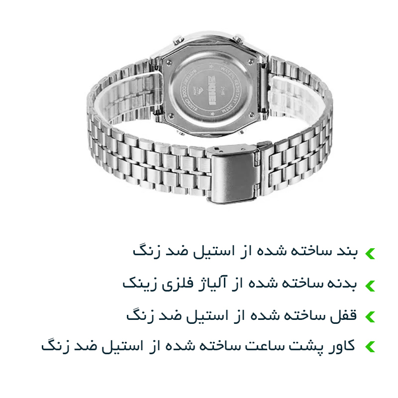 - ویژگیهای ساعت : قابلیت نمایش 24 ساعته,تاریخ شمار,نور پس زمینه,تایمر,آلارم,